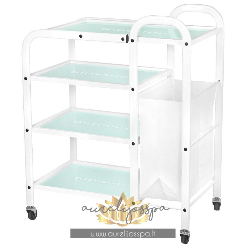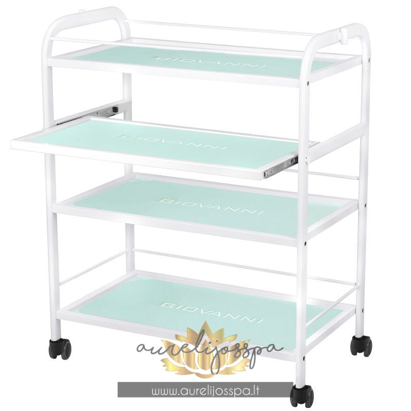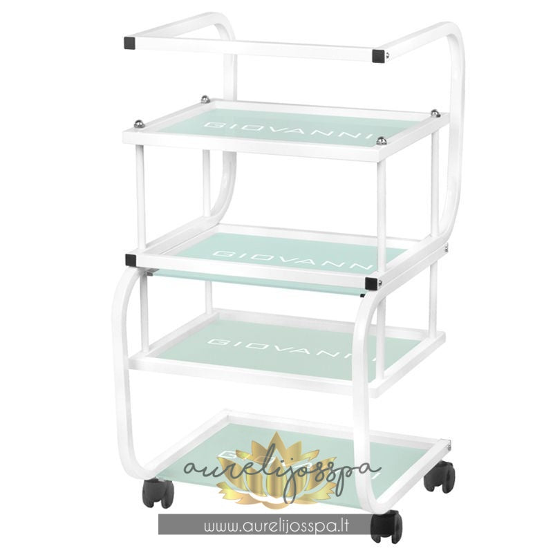 Estetiškai atrodantis kosmetologinis staliukas turi net keturias grūdinto stiklo lentynas, kurios yra išgraviruotos GIOVANNI logotipu.